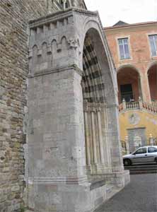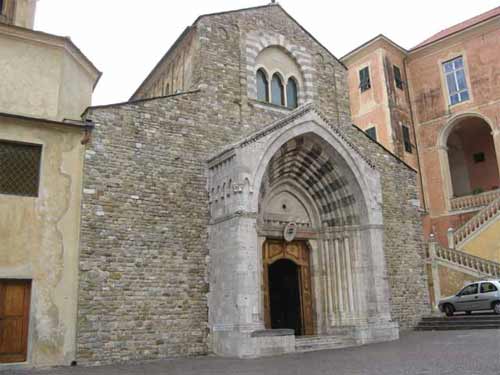 Il protiro della facciata e la soprastante polifora, ricostruita, risalgono ad un epoca successiva alla vittoria di Genova nella guerra secolare con Ventimiglia e ne costituiscono il tangibile segno del dominio.