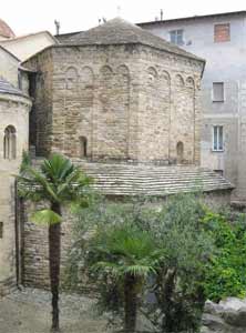 Addossato alla parte absidale della chiesa si trova uno dei monumenti romanici più importanti della Liguria, il battistero ottagonale risalente alla fine dell'XI secolo. La parte inferiore a muratura liscia è sormontata da quella superiore le cui specchiature sono delimitate da lesene piatte raccordate da archetti. Entrambe le linee di gronda sono sottolineate da una cornice a dentelli.