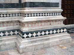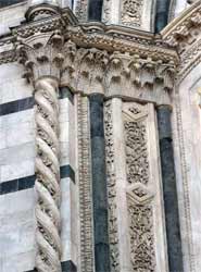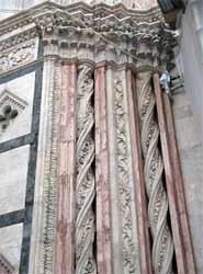 Il portale principale è affiancato da due grandi colonne marmoree ricoperte da una ricca decorazione a girali di ispirazione classica, forse opera di Giovanni Pisano. Tutti i rilievi in facciata sono copie dagli originali conservati nel Museo dell'Opera.