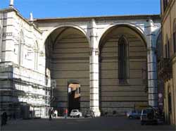 Sulla piazza S. Giovanni prospetta la facciata inconpiuta del battistero che, a causa del dislivello, costituisce quasi una cripta del duomo e ne sostiene il presbiterio. Il basstistero venne costruito nel 1316-25 mentre la facciata risale nella forma attuale al 1382.