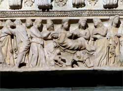 Il portale centrale si differenzia per l'architrave istoriata con Storie di S. Gioacchino e S. Anna da Tino di Camaino.